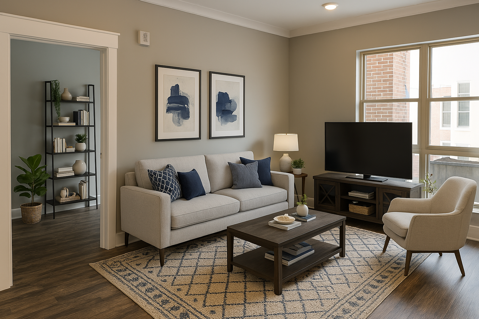 Prompt:“Attached is the file “LivingRoom-Unit404-RiverlaneFlats.jpg.” Please provide me a virtually staged model that includes the following: Furniture: Standard sized couch, adjacent accent chair, coffee table, bookshelf, TV console, and TV Decor: Add a few plants but no more than 3, and a few items scattered across the furniture to show a homey, lived-in but clean apartment home, and one main area rug. Design/aesthetic: Using the transitional design aesthetic, use a mix of cool and neutral tones with pops of dark navy blue throughout.”